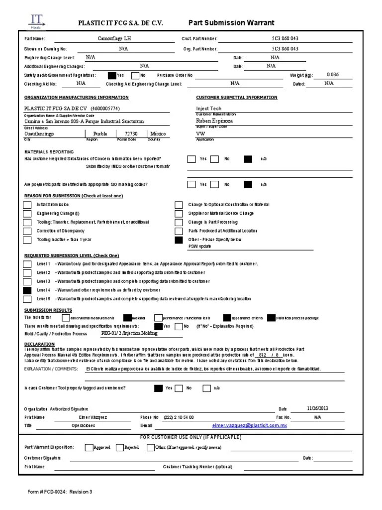 The document is a part submission warrant used for submitting parts to customers, detailing essential information such as part name, number, safety regulations, engineering. You can also download it, export it or print it out. The document is a fundamental part of a managed quality process called the production part approval process (ppap). A part submission warrant document or form.